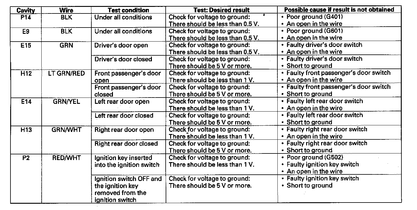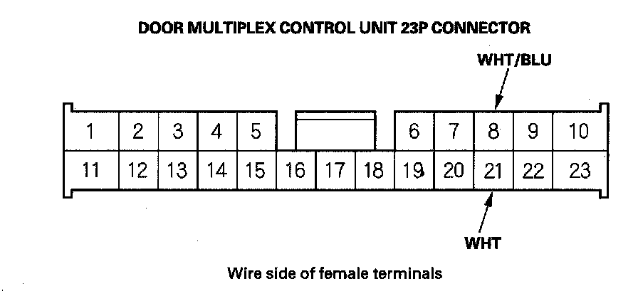 11. Reconnect the connector to the door multiplex control unit. Turn the ignition switch ON (II), and make these input tests at the appropriate connector.