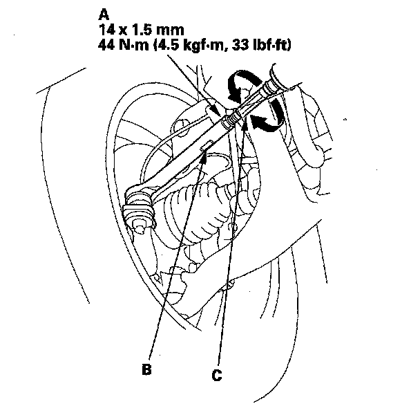 3. Hold the adjusting bolt (A) on the rear lower arm B, and remove the self-locking nut (C).