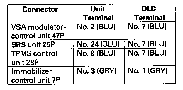 NO - Repair short in the wire between DLC terminal No. 7 (K-line) and the VSA modulator-control unit, the SRS unit, the TPMS control unit, or DLC terminal No. 1 (DIAG-H line) and the immobilizer control unit.