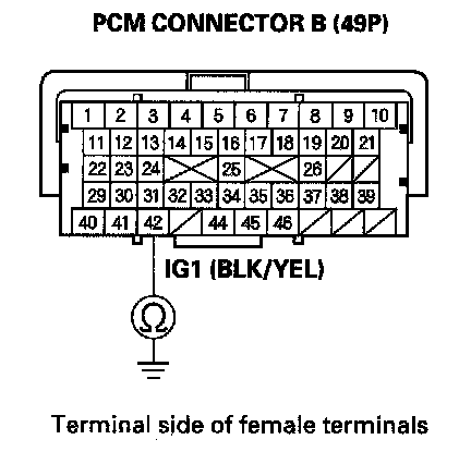 48. Check for continuity between PCM connector terminal B42 and body ground.