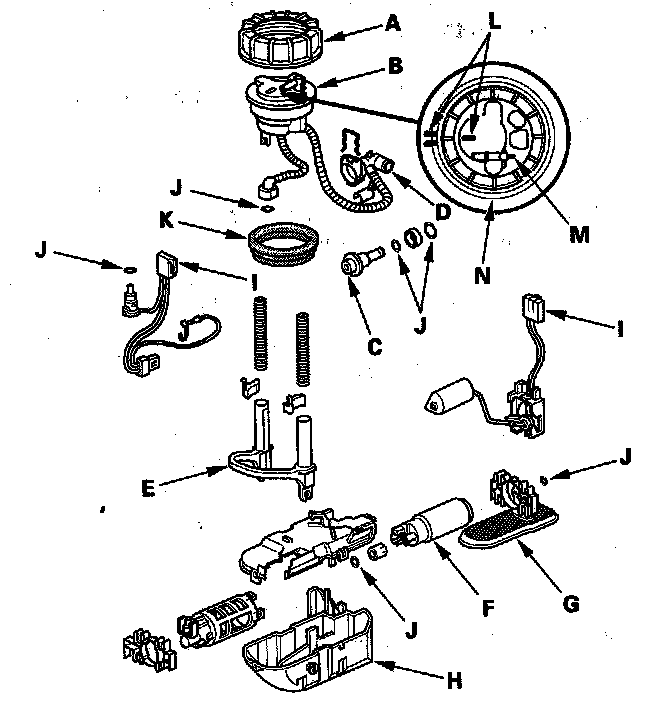 13. Install the parts in the reverse order of removal with new O-rings (J) a new base gasket (K), and a new locknut when installing the fuel tank unit, align the marks (L) on the fuel tank unit (M) and the fuel tank (N).