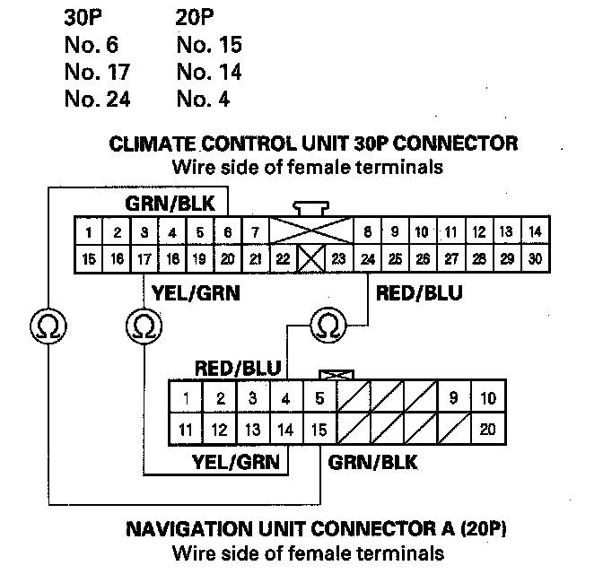 3. Check for continuity between the above terminals of the climate control unit 30P connector and navigation unit connector A (20P).