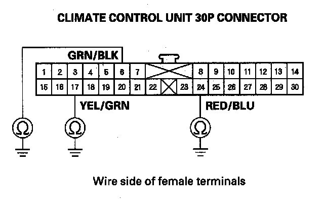 4. Check for continuity between body ground and the climate control unit 30P connector terminals No. 6, 17 and 24 individually.