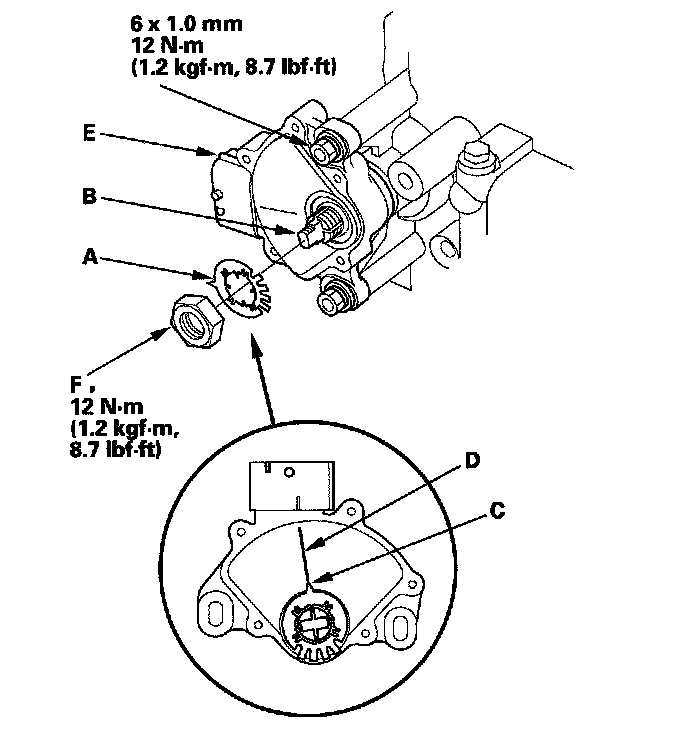 15. Install the new lock washer (A) over the selector control shaft (B) while aligning the projection (C) of the lock washer with the N positioning line (D) on the transmission range switch (E), and install the locknut (F).