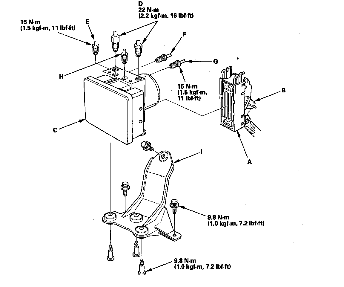 3. Remove the three 6 mm bolts, then remove the VSA modulator-control unit with bracket (I) from the body.