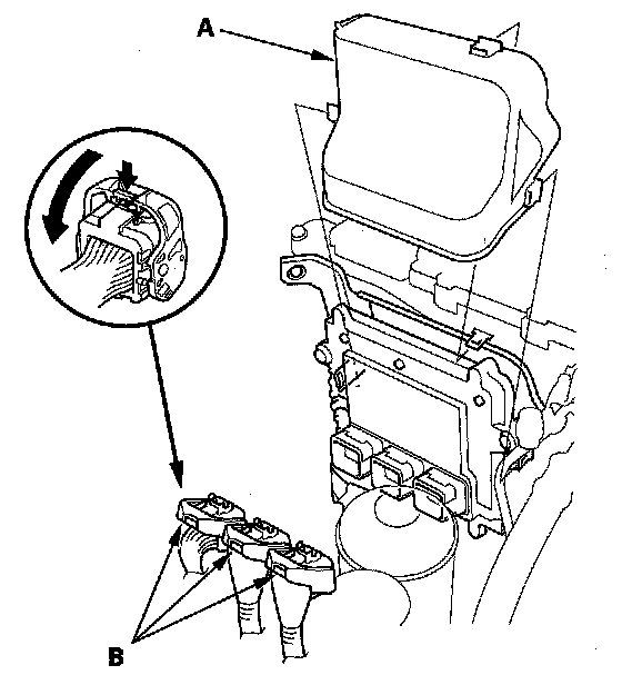 2. Remove the cover (A). Disconnect a PCM connector (B), and probe the terminals from the terminal side of the connectors.