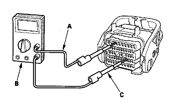 5. Connect one side of the patch cord (A) terminals to a commercially available digital multimeter (B), and connect the other side of the patch cord terminals to a commercially available banana jack (Pomona Electronics Tool No. 3563 or equivalent) (C).