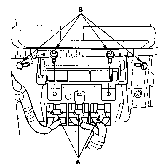 7. Disconnect the three connectors (A) and remove the TORX bolts (B), then pull out the SRS unit.