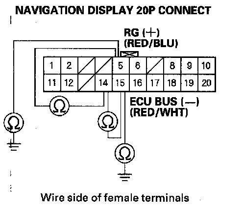 6. Check for continuity between the navigation display 20P connector terminal No. 14 and terminals No. 5 and No. 15 individually. Check for continuity between navigation display 20P connector terminals No. 5 and No. 15 to body ground individually.