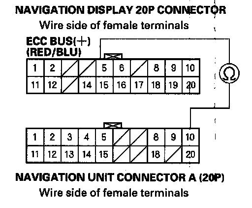 7. Check for continuity between the navigation display 20P connector terminal No. 5 and navigation unit connector A (20P) terminal No. 10.