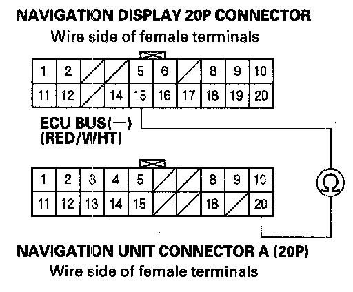8. Check for continuity between the navigation display 20P connector terminal No. 15 and navigation unit connector A (20P) terminal No. 20.
