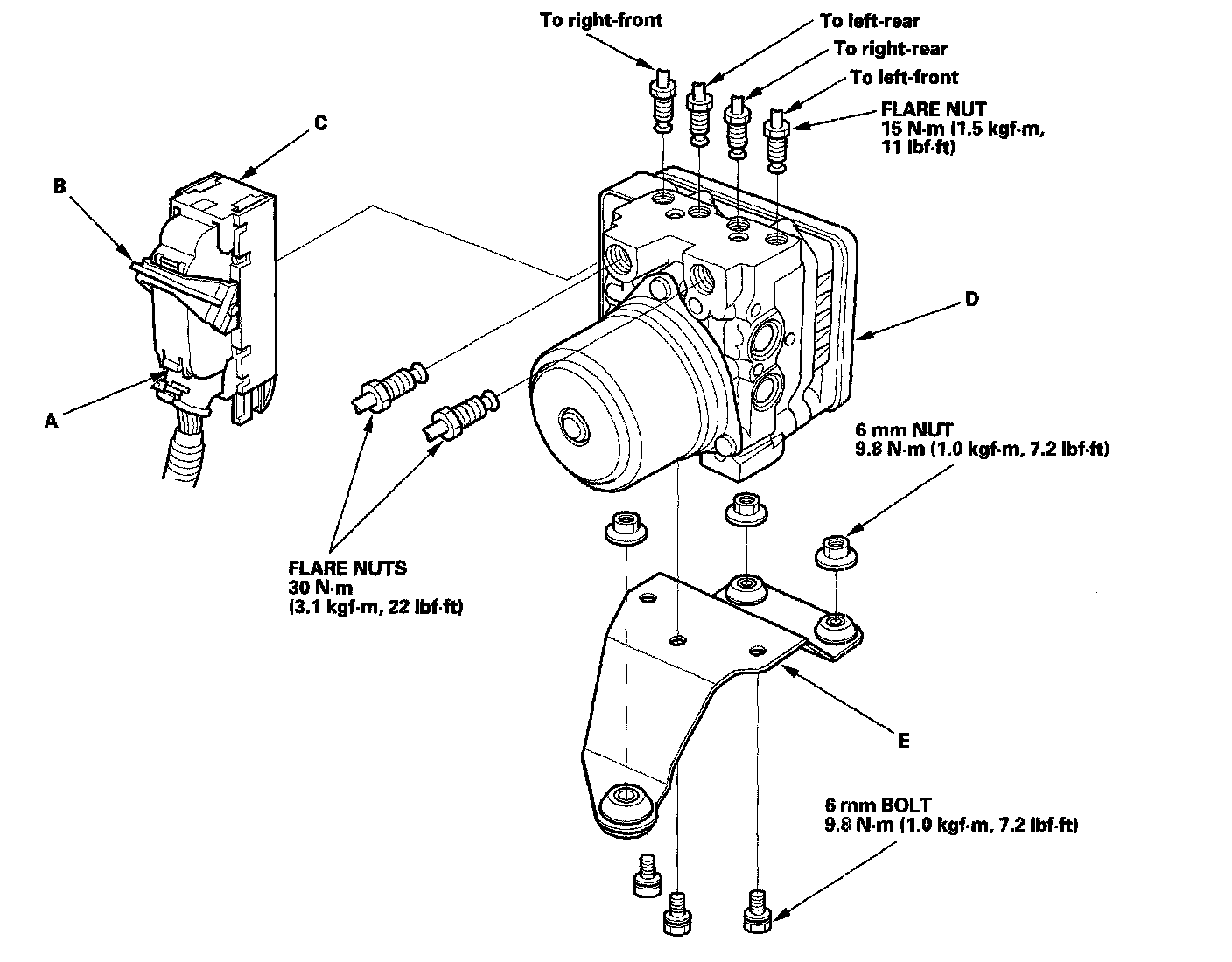 3. Remove the three 6 mm nuts, then remove the VSA modulator-control unit with bracket (E) from the body.