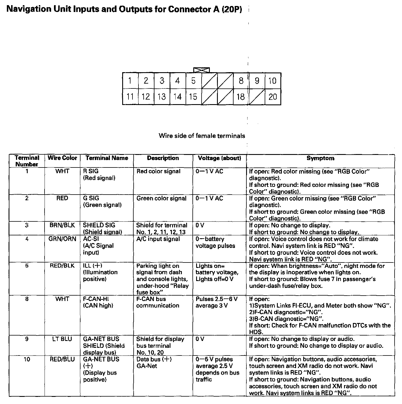 Navigation Unit Inputs and Outputs for Connector A (20P) - Part 1: