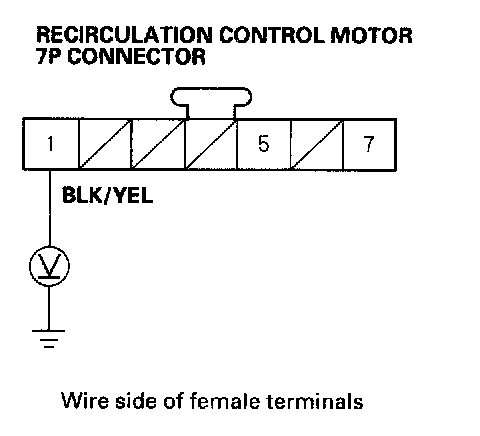 4. Measure the voltage between the No. 1 terminal of the recirculation control motor 7P connector and body ground.
