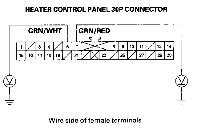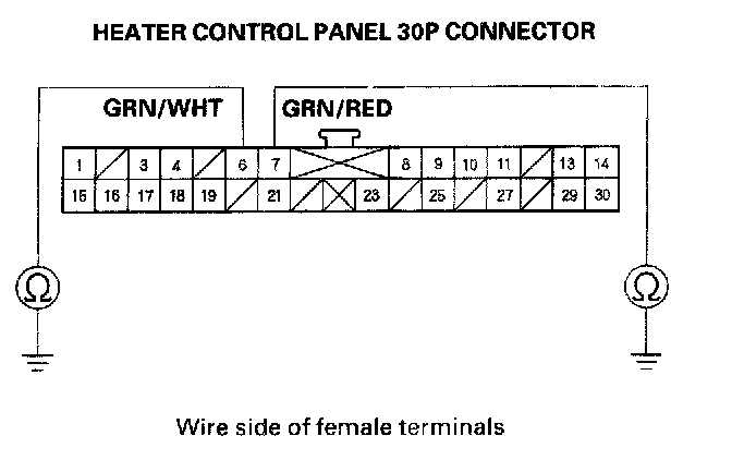 8. Check for continuity between the No. 6 and No. 7 terminals of the heater control panel 30P connector and body ground individually.