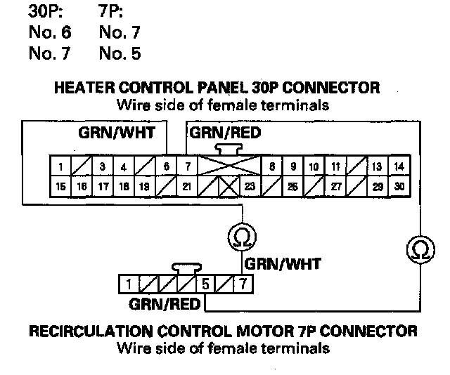 11. Check for continuity between the following terminals of the heater control panel 30P connector and the recirculation control motor 7P connector.