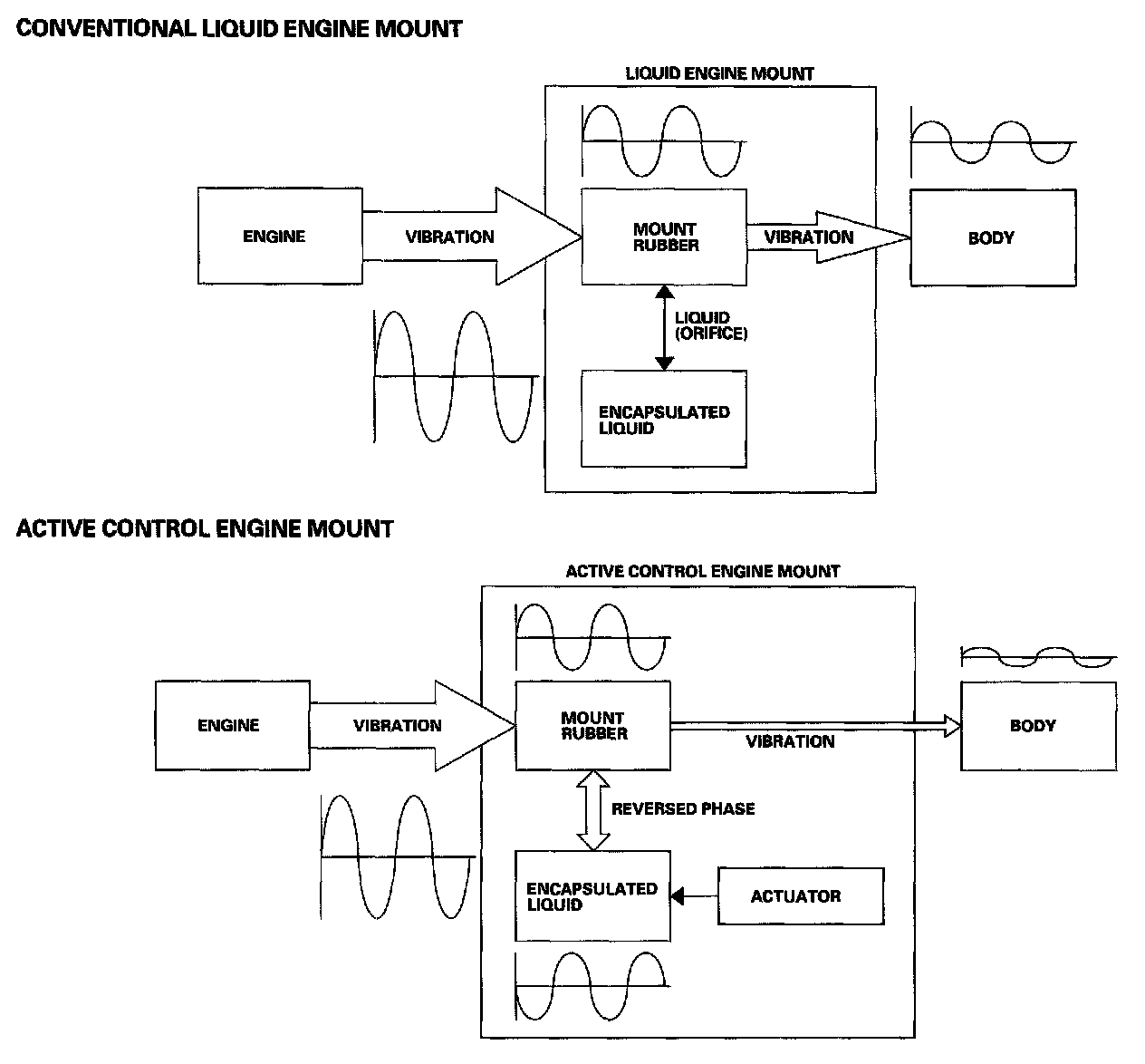 The active control engine mount (ACM) system decreases engine-to-chassis vibration at low rpm and when the engine is in cylinder pause mode. The system includes conventional, liquid-filled engine mounts that absorb vibration. In addition, the front and rear engine mounts contain an actuator that cancels engine vibration by producing a counter, or reverse vibration. The transmission has standard rubber mounts.