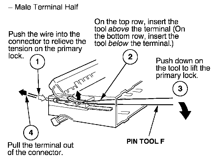 Before you begin, inspect the wire you are about to repair for damage and length. Make sure the wire will be long enough to make a terminal repair without stretching it when you reinstall the terminal in the connector. If the wire is too short, or if access to the connector is too restricted to make a terminal repair, you may need to install a pigtail terminal (a short length of wire with a factory-crimped terminal on it). Refer to HOW TO INSTALL PIGTAIL TERMINALS.
