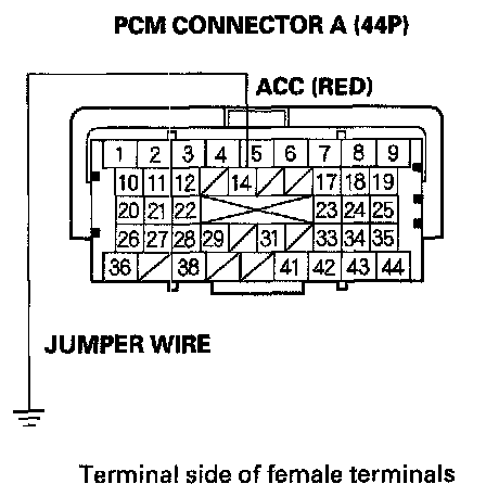 13. Momentarily connect PCM connector terminal A14 to body ground with a jumper wire several times.
