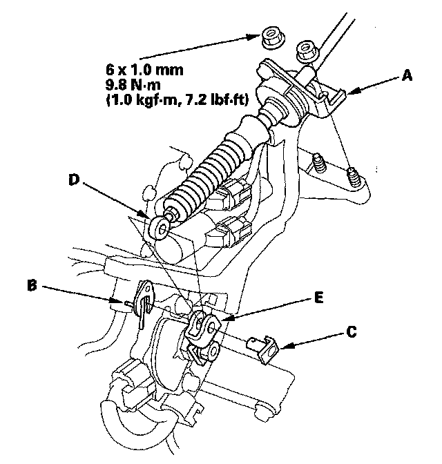 7. Remove the spring clip/washer (B) and control pin (C), then separate the shift cable end (D) from the control lever (E).