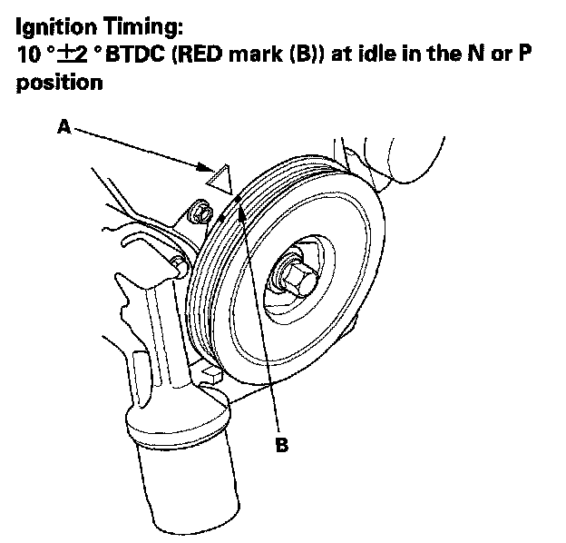 6. Aim the light toward the pointer (A) on the timing belt cover. Check the ignition timing under a no load condition, (headlights, blower fan, rear window defogger, and air conditioner are turned off)