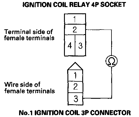 4. Check for continuity between ignition coil relay 4P socket terminal No.2 and the No.1 ignition coil 3P connector terminal No.3.