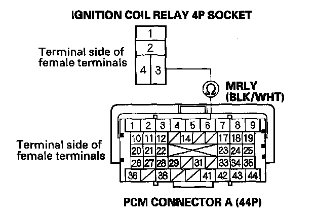 NO - Repair open in the wire between ignition coil relay 4P socket terminal No.3 and the PCM (A6).