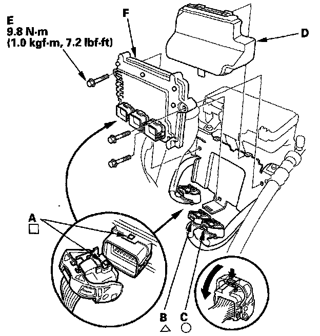 12. Remove the bolts (E), then remove the PCM (F).