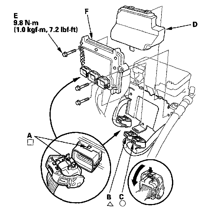 10. Remove the bolts (E), then remove the PCM (F).