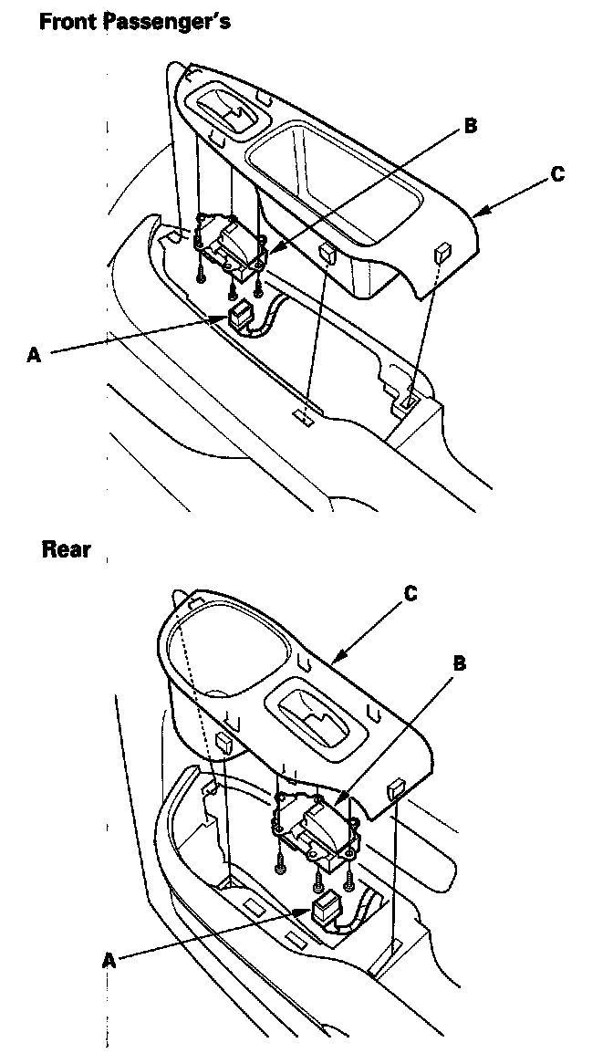 2. Disconnect the 6P connector (A) from the power window switch (B), then remove the three mounting screws and the power window switch from the switch trim (C).