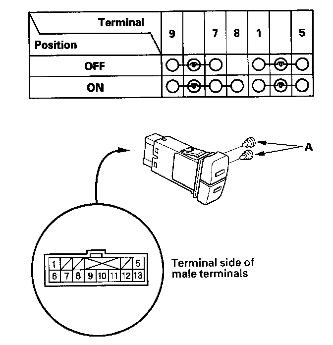 3. Check for continuity between the terminals in each switch position according to the table. If there is no continuity, replace indicator bulbs (A) or the switch.