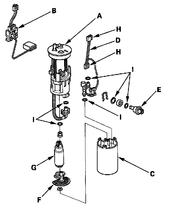 3. When connecting the fuel pump assembly, make sure the connection is secure and the suction filter (F) is firmly connected to the fuel pump (G),