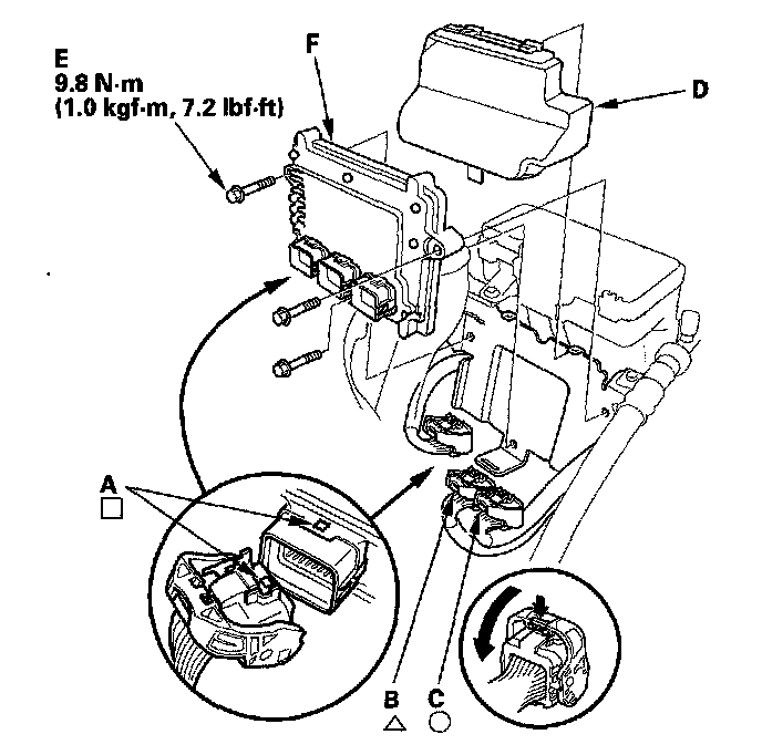 10. Remove the bolt (E), then remove the PCM (F).