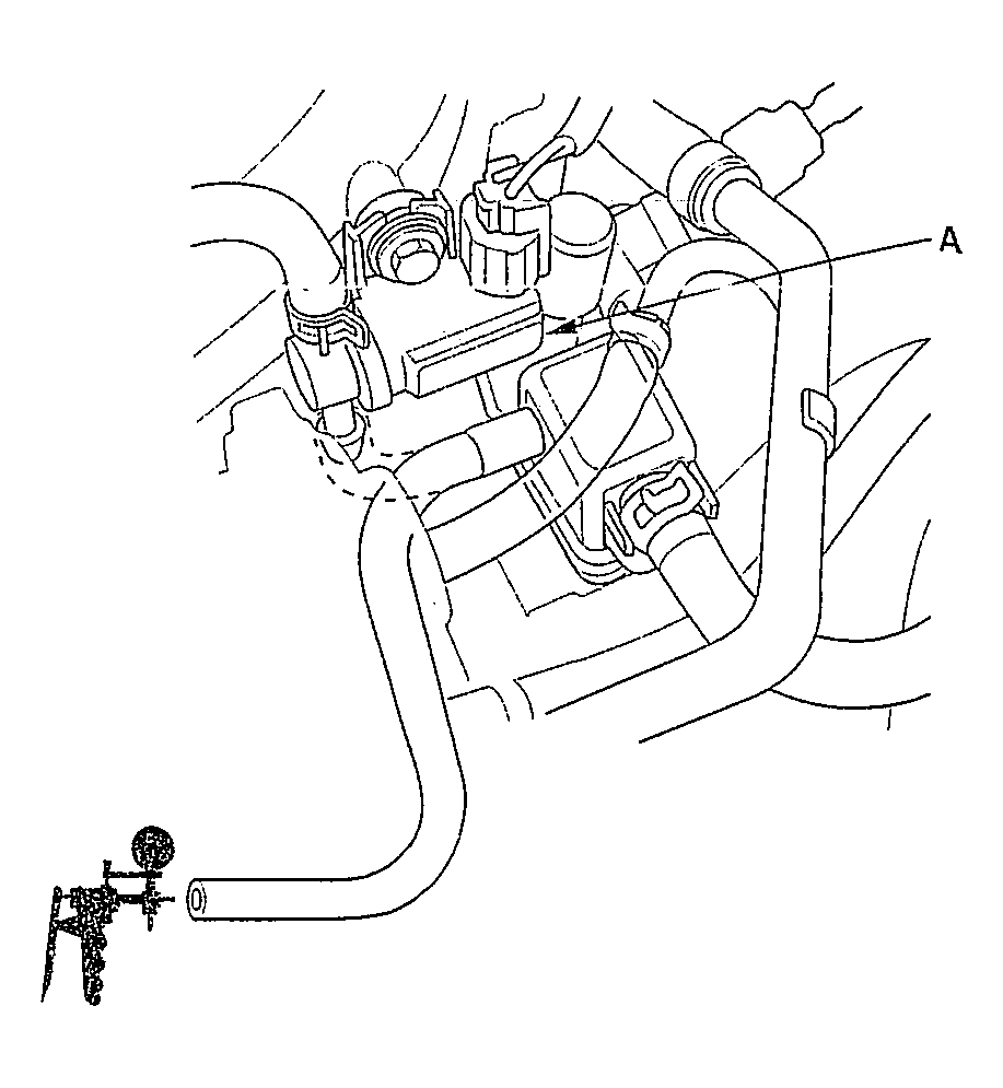 - Disconnect the vacuum hose (purge line) from the EVAP canister purge valve (A) in the engine compartment, and connect the vacuum pump/guage, 0-30 in.Hg, to the vacuum hose as shown in Fig 3.