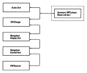 The GA-Net bus passes audio and navigation commands throughout the navigation and audio components. These commands include navigation touch screen and hard button signals, audio/XM selections by voice, and XM station and music title names. Because the entire bus is "daisy chained" between components (see Fig 1), any open or short in the GA-Net bus harness will cause any or all of these functions to become inoperative. The addition of any audio accessory must maintain the continuity of the GA-Net bus by installing the "Y" cable included with the accessory kit.