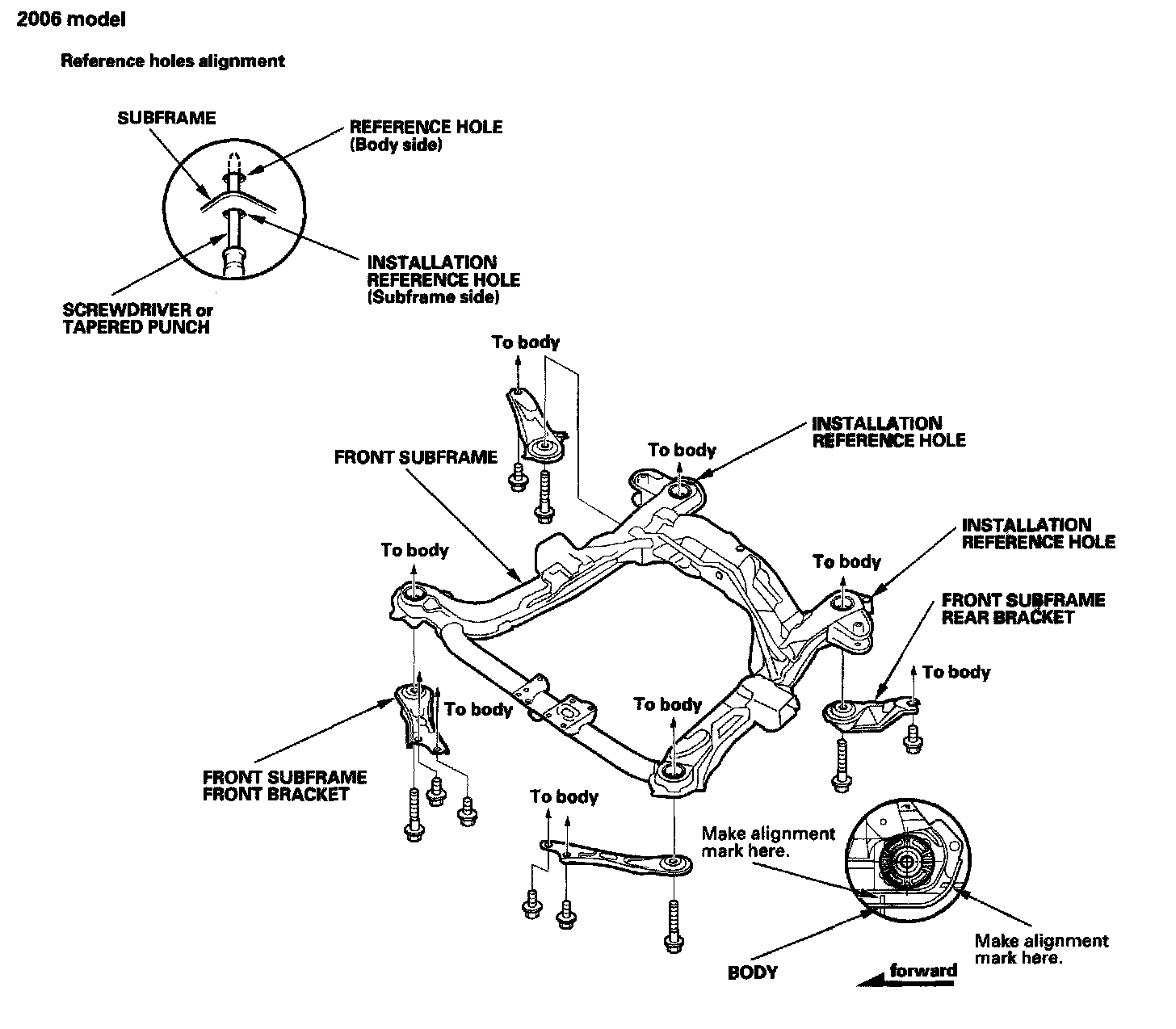- Before removing the subframe, make a mark where the subframe lines up with the body for reinstallation.