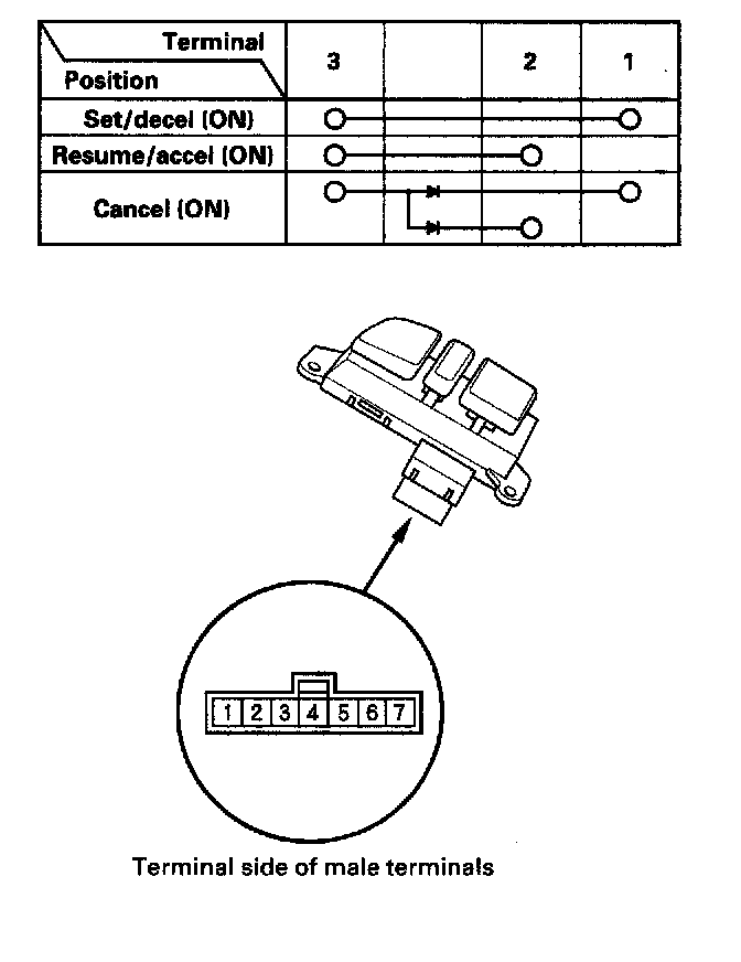 - If there is continuity, and it matches the table, but switch failure occurred on the cruise control input test, check and repair the wire harness on the switch circuit.