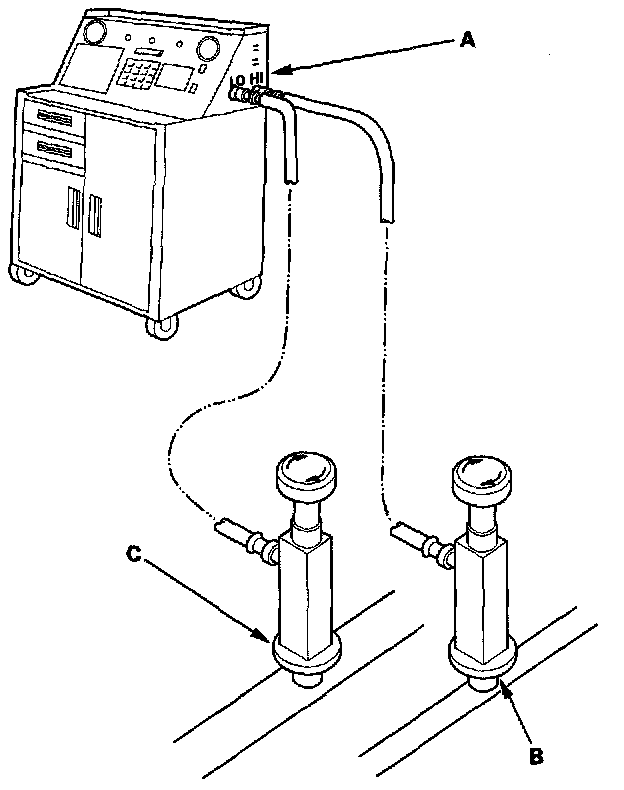 1. Connect an R-134a refrigerant recovery/recycling/ charging station (A) to the high-pressure service port (B) and the low-pressure service port (C), as shown, following the equipment manufacturer's instructions.