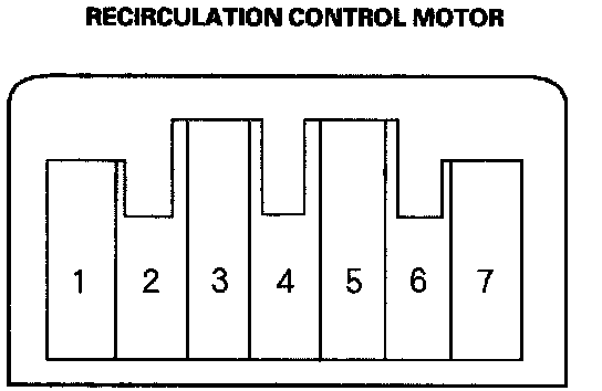 2. Connect battery power to the No. 1 terminal of the recirculation control motor, and ground the No. 5 and No. 7 terminals; the recirculation control motor should run smoothly. To avoid damaging the recirculation control motor, do not reverse power and ground. Disconnect the No. 5 or No. 7 terminals from ground; the recirculation control motor should stop at Fresh (when the No. 7 terminal is disconnected) or Recirculate (when the No. 5 terminal is disconnected). Don't cycle the recirculation control motor for a long time.