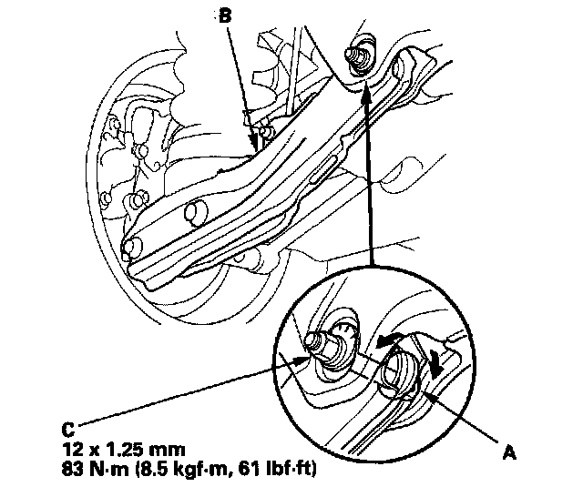 3. Hold the adjusting bolt (A) on the lower arm B, and remove the self-locking nut (C).