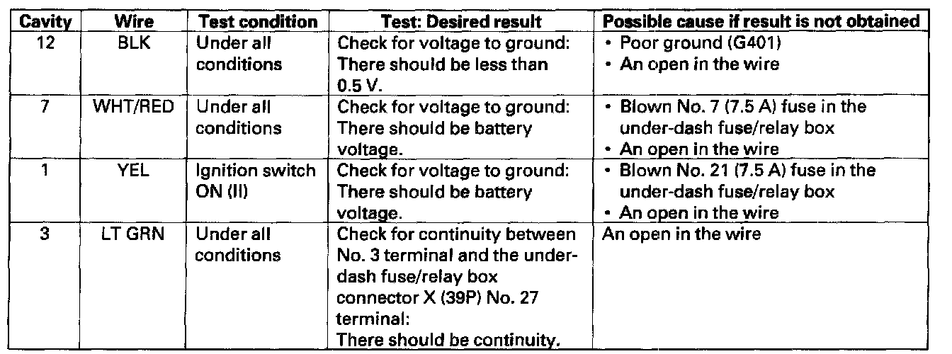Combination Switch Control Unit Input TestNOTE: Check the No.22 (120 A) No. 23 (50 A), No. 15 (40 A) fuse in the under-hood fuse/relay box before troubleshooting.