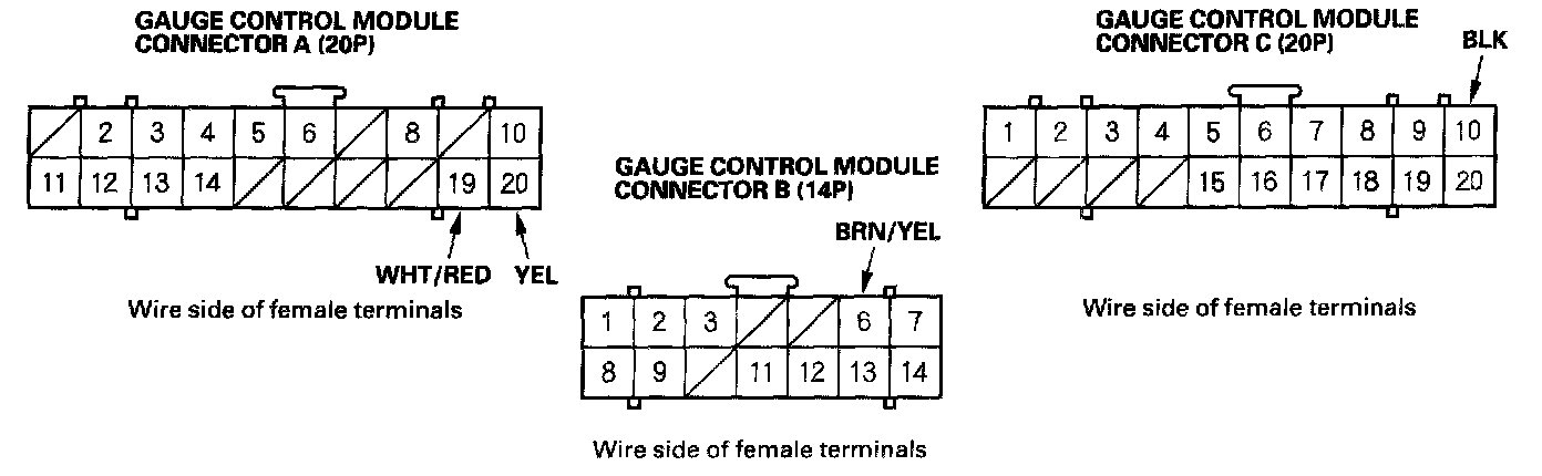 6. Reconnect connectors A and C to the gauge control module, and make these input tests at the connector.