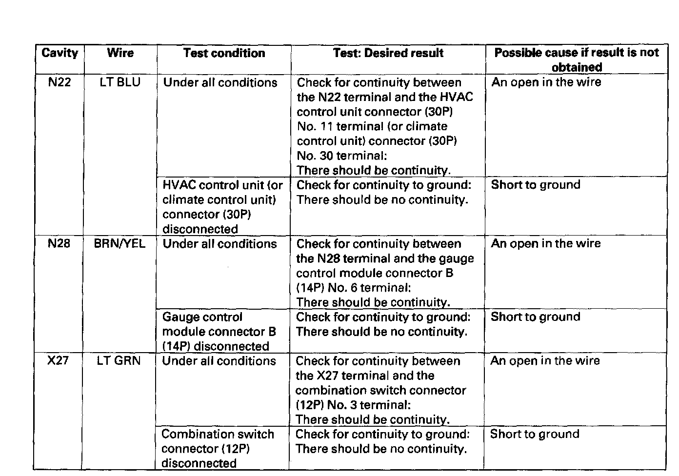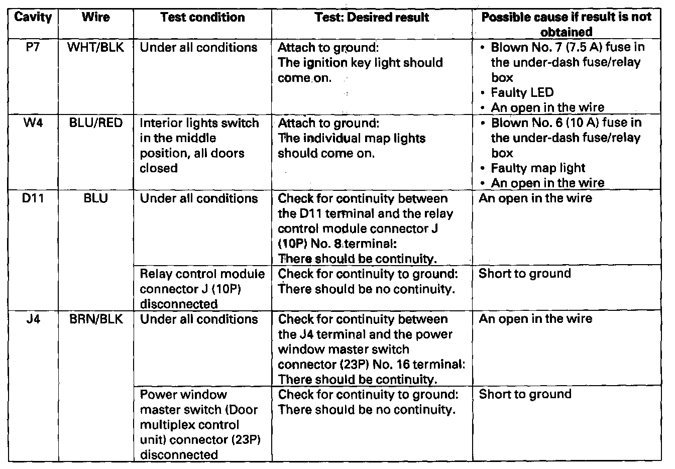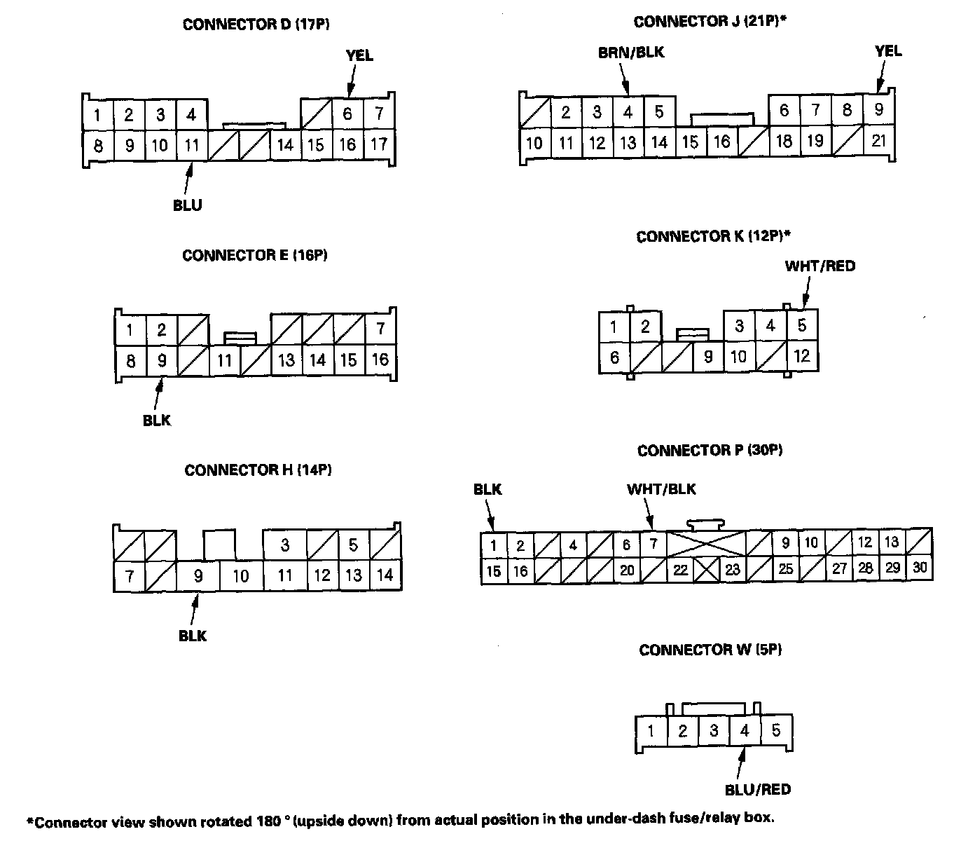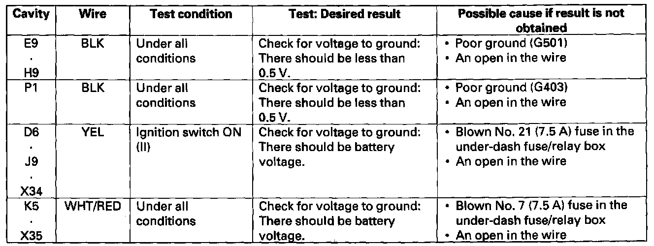 7. Reconnect the connectors to the under-dash fuse/relay box, and make sure these input tests at the appropriate connectors on the under-dash fuse/relay box.