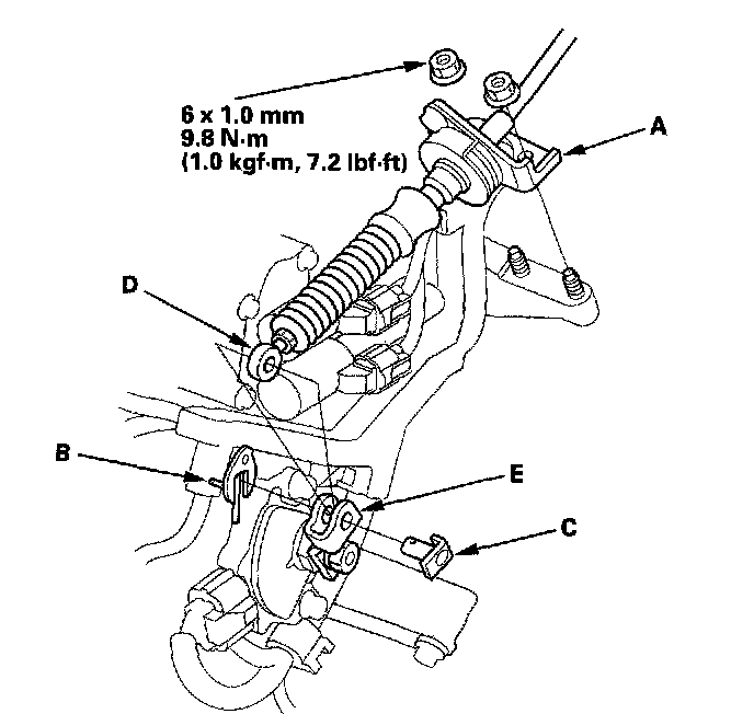 7. Remove the spring clip/washer (B) and control pin (C), then separate the shift cable end (D) from the control lever (E).