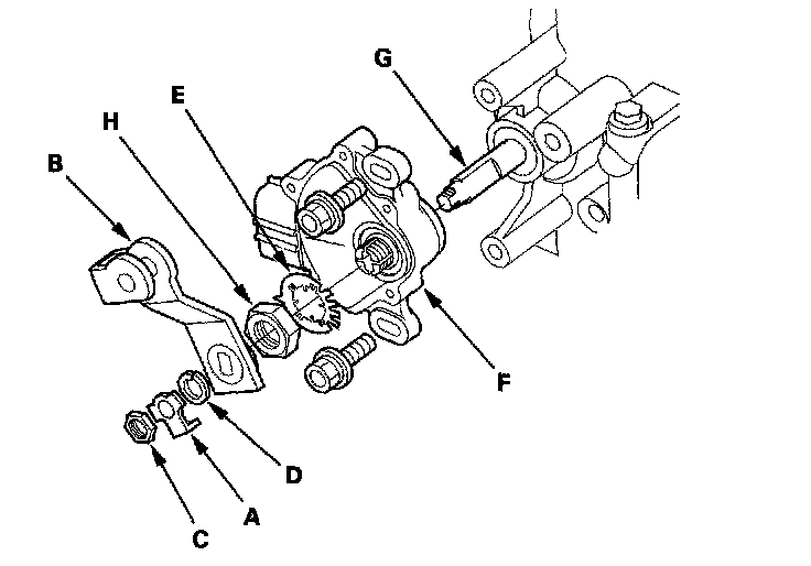 10. Pry the lock tabs of the lock washer (E) on the transmission range switch (F), hold the selector control shaft (G) with a 6.0 mm wrench, and loosen the locknut (H).