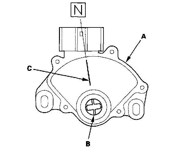 12. Set the new transmission range switch (A) to the N position. The transmission range switch clicks in the N position, and the control shaft hole (B) aligns with the N position line (C).