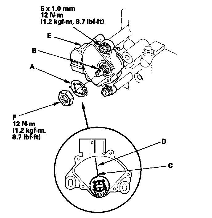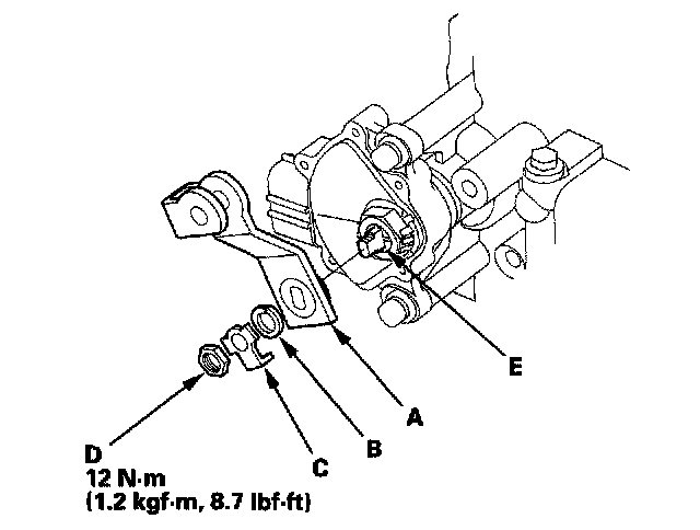 15. Install the new lock washer (A) over the selector control shaft (B) while aligning the projection (C) of the lock washer with the N positioning line (D) on the transmission range switch (E), and install the locknut (F).