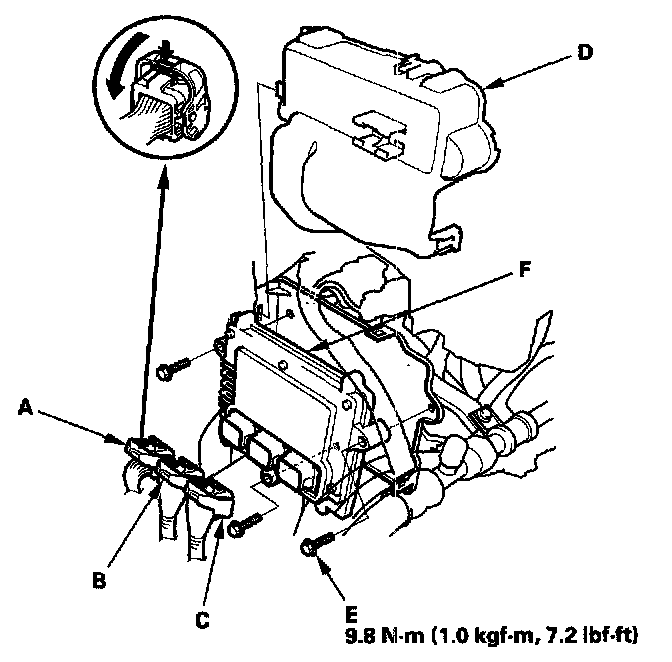 12. Remove the bolts (E), then remove the PCM (F).