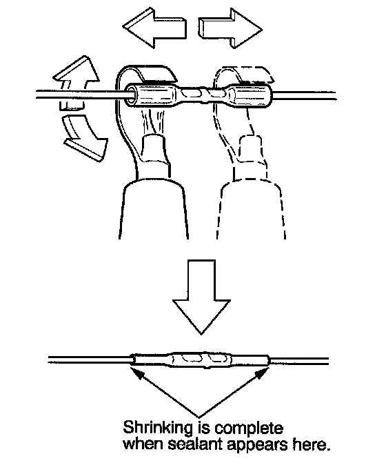 13. Plug in the heat gun, and turn it on. Start at the middle of the splice connector, and move the gun toward the ends as the tube shrinks. Apply heat evenly by rotating the curved heat spreader around the splice connector. Shrinking is complete when a small amount of sealant appears at each end of the tube.