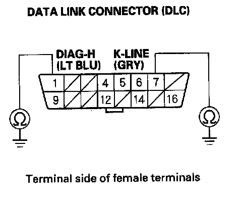 15. Check for continuity between DLC terminals No. 1 and No. 7 and body ground individually.